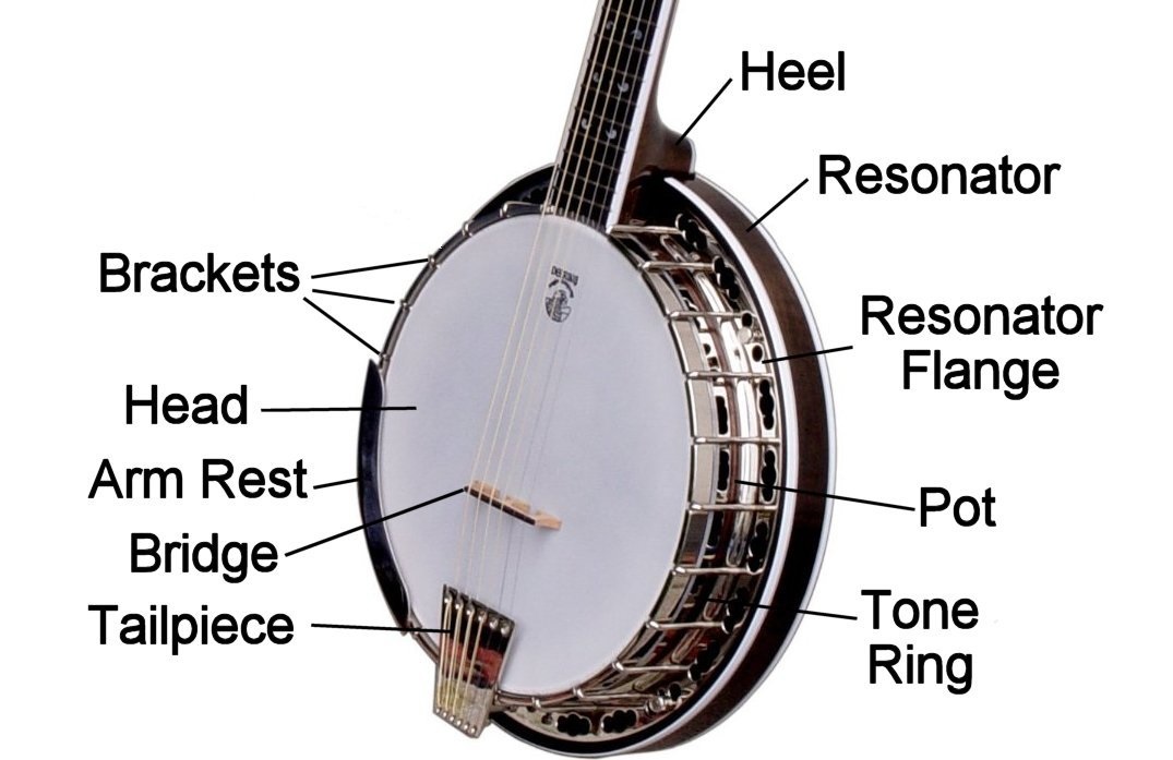 The components or parts of a standard Banjo are brackets, head, arm–rest, bridge tailpiece, tone ring, pot, resonator flange, resonator and heel.