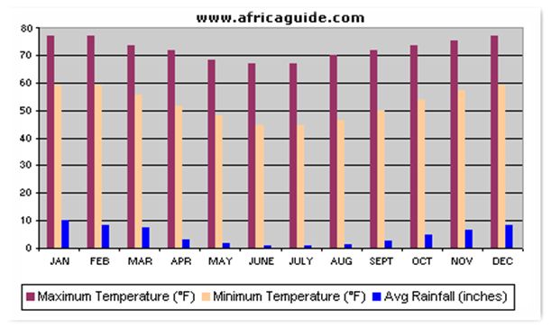 The climatic conditions in Swaziland vary from tropical to temperate. Swaziland has four seasons in a year; Spring (September to October), Summer (November to March), Autumn (April to May) and Winter (June to August). The seasons in Swaziland are completely reverse to that of the countries situated in the Northern Hemisphere – December being the Summer and June being the Winter. The regions in the higher altitude are much cooler and cloudy than the other regions of the country. The Western part of the country that includes the mountains, faces high level of humidity. These mountainous regions receive high rainfalls, which are accompanied by thunderstorms. Rainfall in the country is mostly experienced during the summer months. The temperatures and rainfall in the eastern parts is comparatively less than the central as it experiences much drier climate. The important factor that affects the weather conditions in Swaziland is the maritime air, originating in the Indian Ocean.